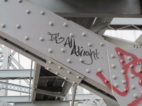 I have always liked graffiti, but on my walk over the bridge I realized that most street artists take the time to write positive and uplifting messages about love and our human connection. Isn’t that nice?
