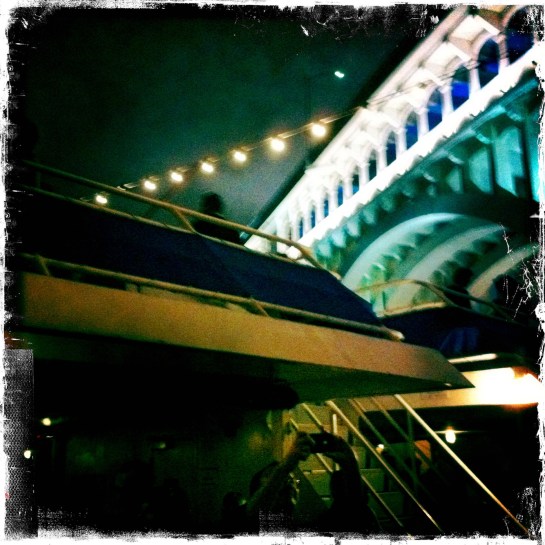 The silhouetted figure with the hat on the second deck reminds me that since I took this photo I’ve taken to wearing a similar type hat. In fact, I kinda wish that had been me up there, having the time to stare downriver, the Goodtime river cruise skirting around those Cuyahogan bends, with the pre-rain chill of that September night. Alas, I was running around performing the Rock and Roll equivalent of herding cats instead. But I still remember taking a moment before snapping this, to stare up at the passing Detroit-Superior Bridge, the object which literally adorns the front yard of my building, and realizing what a novel moment in life it was to be on a boat, with all my friends, cruising in, out, and around the city I love, passing within a stone’s throw of the bed in which I lay my head, with all of it sound-tracked by my favorite bands in town. And as I ran back to the stage, the only thoughts in my head were: Do what you love, and the rest will follow.