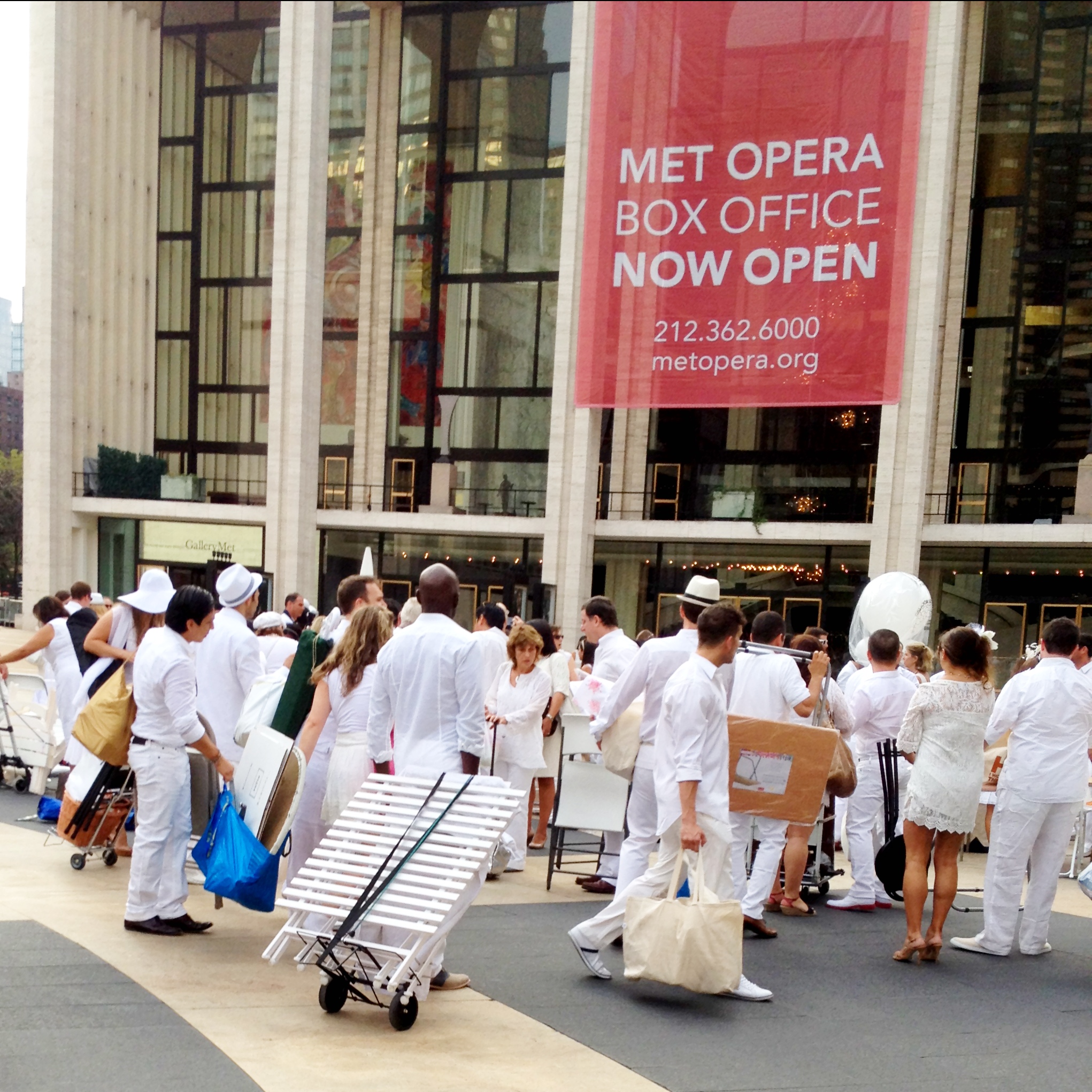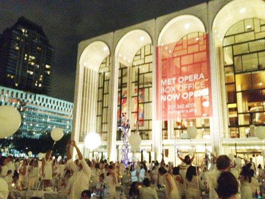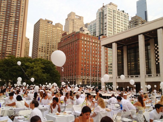 On Monday evening after work a few friends and I (dressed all in white) hauled four folding chairs and a folding table to the corner of 73rd Street and Amsterdam Ave. to meet up with a small group of fellow participants in New York’s second Dîner en Blanc. From there we were led to the event’s secret location to set-up for an elegant, outdoor picnic in white. Keeping the location secret until the last minute is one of the defining characteristics of the Dîner en Blanc, which started in Paris several years ago but is now held in several cities around the world.
