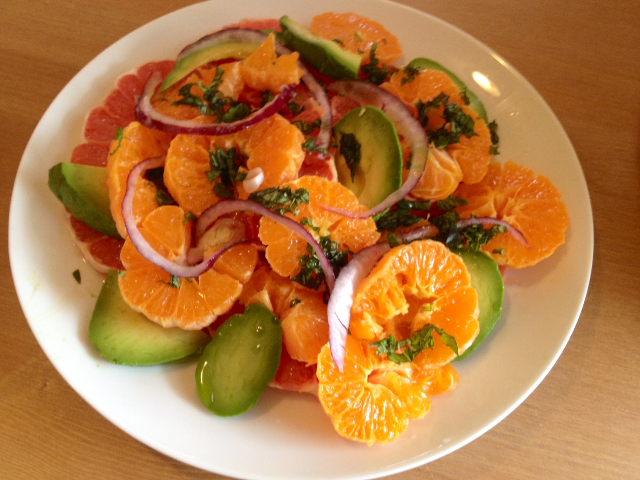 You can cut the fruit and avocado however you like. I cut them into slices. Then, thin the red onions. Layer nicely. Chop herbs or don’t. Pour EVOO and add a pinch of salt.